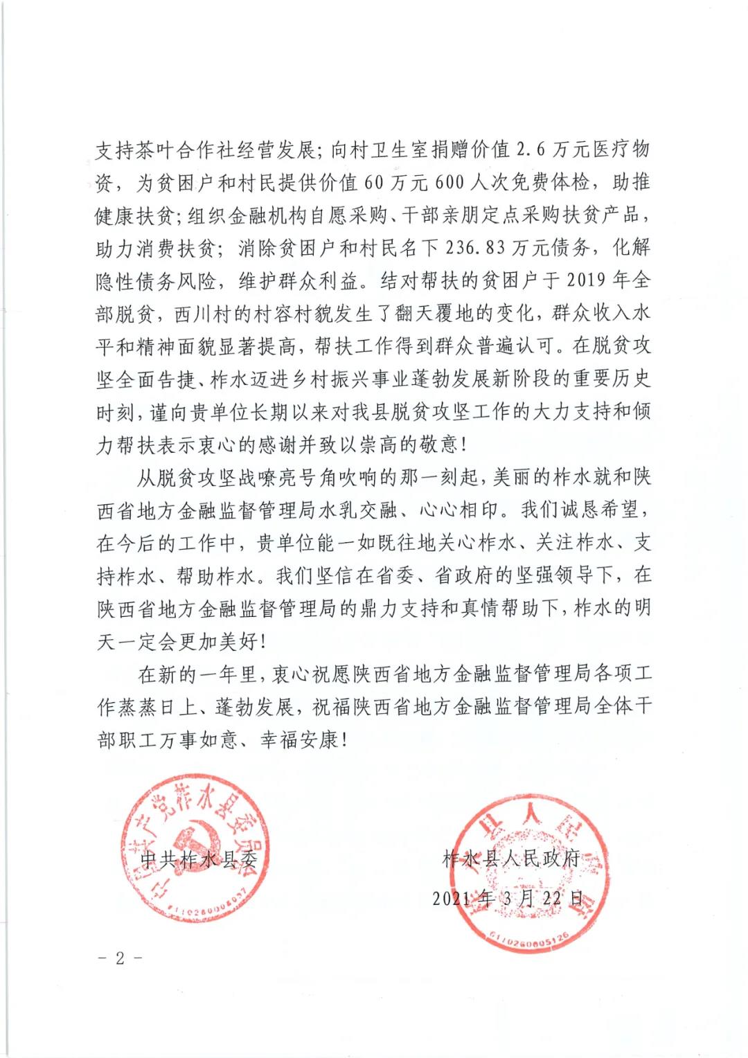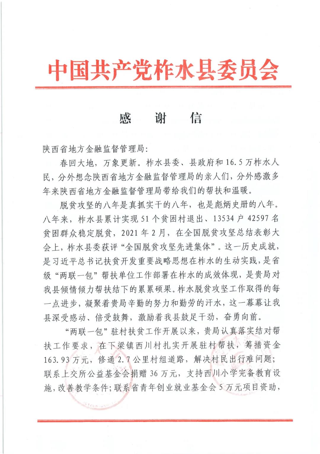 来自柞水县委县政府的感谢信